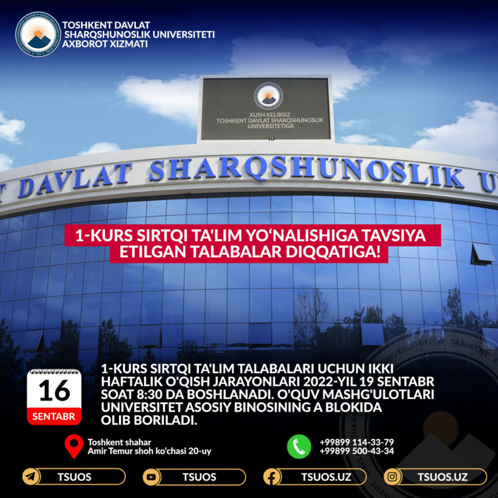 1-kurs sirtqi ta’lim talabalari uchun ikki haftalik o’qish jarayonlari 2022-yil 19-sentabr soat 8:30 da boshlanadi. O’quv mashg’ulotlari universitet asosiy binosining A blokida olib boriladi. Murojaat uchun telefonlar: +99899 114-33-79; +99899 500-43-34
