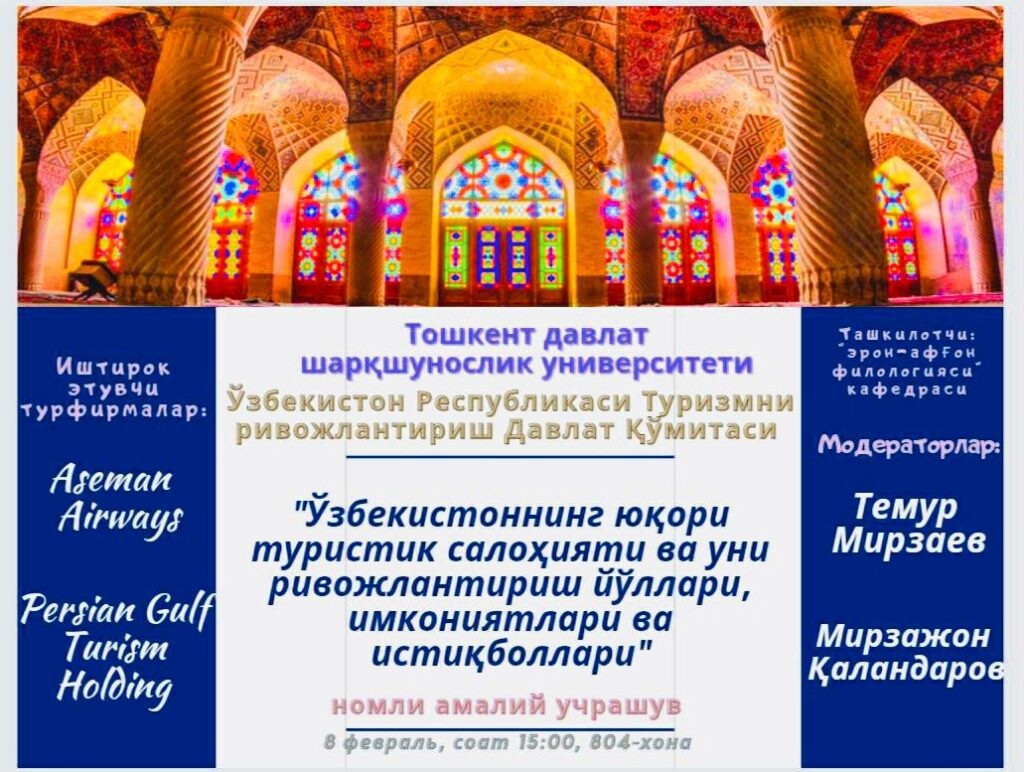 8-fevralda O‘zbekistonning turistik jozibadorligini targ‘ib etish maqsadida O‘zbekiston Respublikasi Turizmni rivojlantirish Davlat qo‘mitasi hamda Toshkent davlat sharqshunoslik universiteti, Eron-afg‘on filologiyasi kafedrasi hamkorligida tadbir tashkil qilindi. Unda Eron Islom Respublikasi tomonidan ASEMAN aviakompaniyasi va PERSIAN GULF TURISM HOLDING turistik kompaniyalari, O‘zbekistondagi nomdor 6 ta turistik firmalaridan vakillar ishtirok etishdi.