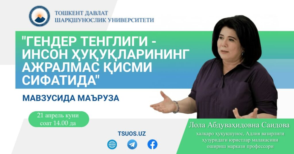 21-aprel kuni, soat 14.00 da TDSHU Madaniyat saroyida xalqaro huquqshunos, Adliya vazirligi huzuridagi yuristlar malakasini oshirish markazi professori Lola Abduvahidovna Saidova bilan «Gender tengligi – inson huquqlarining ajralmas qismi sifatida» mavzusida uchrashuv o‘tkaziladi.