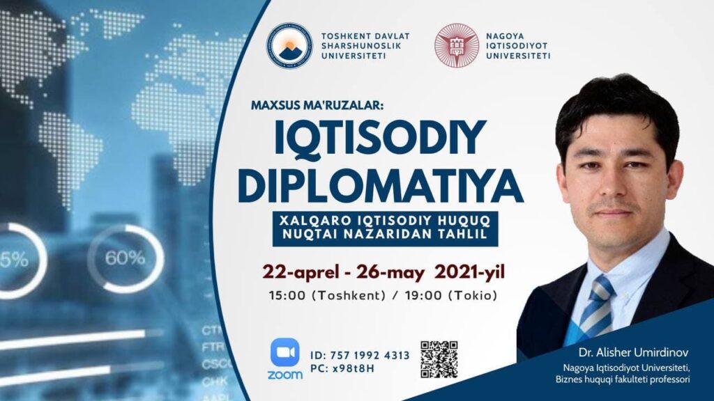 Avval xabar qilganimizdek, 2021-yil 22-apreldan boshlab Nagoya Iqtisodiyot universiteti dotsenti Dr. Alisher Umirdinov Toshkent davlat sharqshunoslik universiteti talabalari uchun “Iqtisodiy diplomatiya (Xalqaro iqtisodiy huquq nuqtai nazaridan tahlil)” mavzusidagi turkum ma’ruzalarini taqdim etmoqda. Ushbu darslar joriy yilning 6-mayiga qadar davom etadi. Qiziquvhchilarni darslarga taklif etamiz.