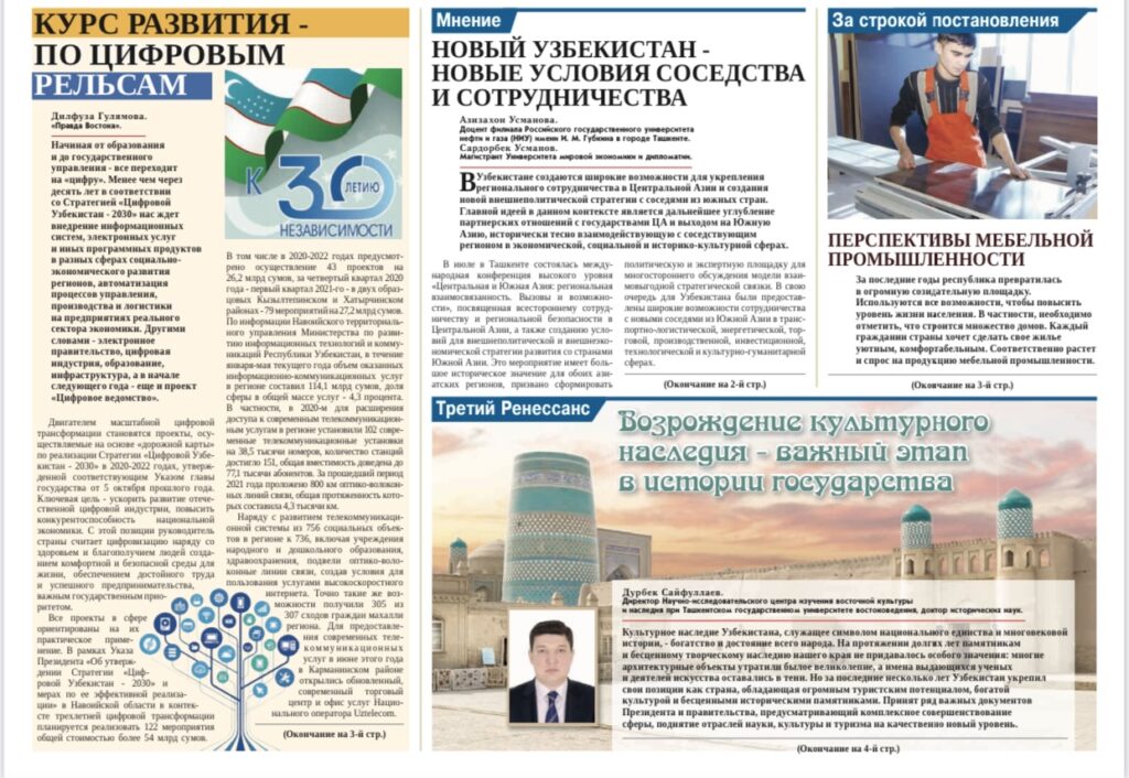 «Правда Востока» gazetasining 5-avgust 2021-yil  157-sonida chop etilgan TDSHU huzuridagi Sharq madaniyati va merosini tadqiq etish ilmiy-tadqiqot markazi direktori, tarix fanlari doktori, dotsent Durbek Sayfullaevning «Возрождение культурного наследия-важный этап в истории государства» nomli maqolasi (rus tilida) bilan tanishishingiz mumkin.