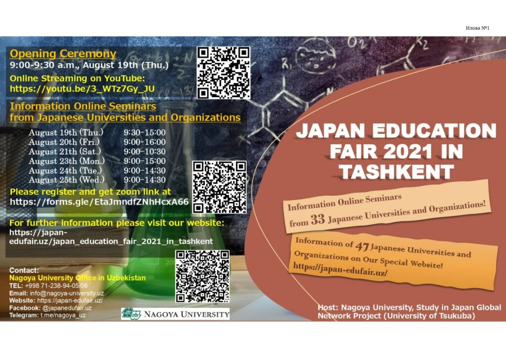 Nagoya universitetining O‘zbekistondagi vakolatxonasi tomonidan 2021-yil 19-25-avgust kunlari onlayn tarzda “Yaponiya ta’lim ko‘rgazmasi – 2021” tadbiri o‘tkazilishi ma’lum qilingan.