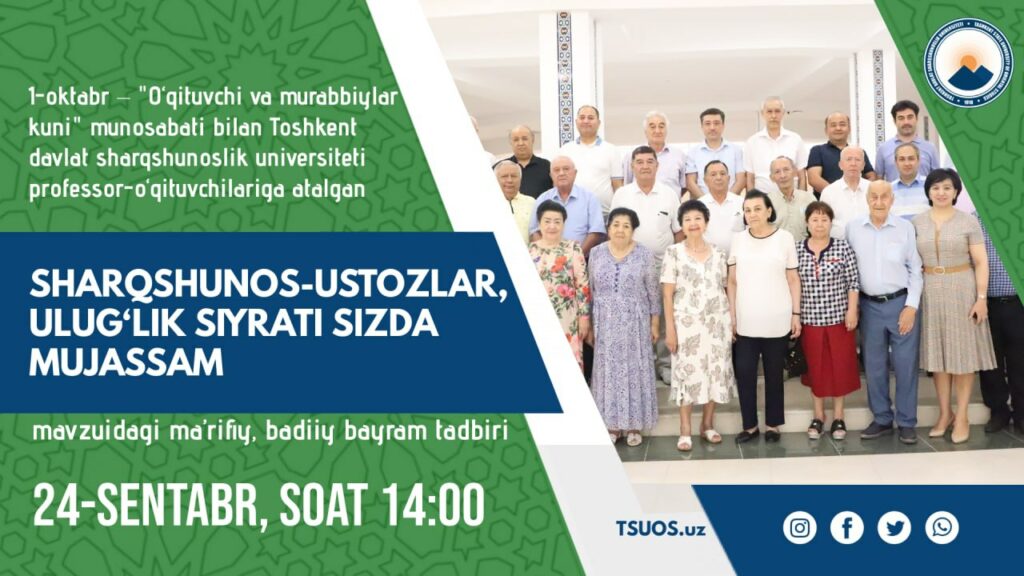 2021-yil 24- sentabr soat 14:00 da 1-oktabr «O‘qituvchi va murabbiylar kuni» munosabati bilan Toshkent davlat sharqshunoslik universiteti professor-o‘qituvchilariga atalgan «Sharqshunos-ustozlar, ulug‘lik siyrati sizda mujassam» nomli ma’rifiy, badiiy bayram tadbiri tashkil etilmoqda.