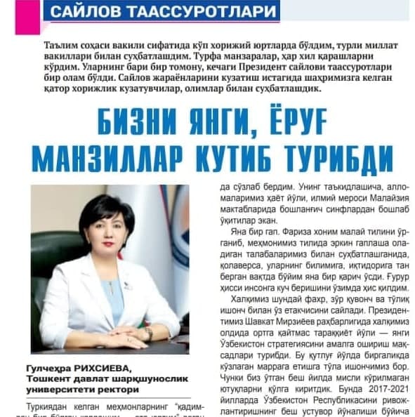 🇺🇿»Yangi O‘zbekiston» gazetasining 2021-yil 28-oktabr 215-sonidagi Toshkent davlat sharqshunoslik universiteti rektori Rixsiyeva Gulchehra Shavkatovnaning  O‘zbekiston Respublikasi Prezidenti saylovi yakunlariga bag‘ishlangan «Bizni yangi, yorug‘ manzillar kutib turibdi» yangi maqolasi chop etildi.