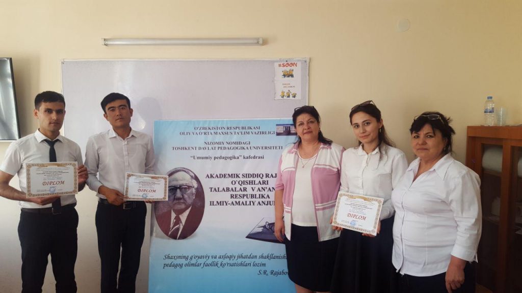 2019-yil 15-may kuni Toshkent davlat pedogogika universitetining “Umumiy pedagogika” kafedrasi tomonidan “Akademik Siddiq Rajabov o’qishlari” talabalar v an’anaviy respublika Ilmiy-amaliy anjumani o’tkazildi. “Akademik Siddiq Rajabov o‘qishlari” talabalar ilmiy-amaliy konferensiyasi materiallari asosida tayyorlangan to‘plamda talaba-yoshlarimizning ta’lim sohasidagi mavzularga ilmiy yondashuvlari asosidagi maqolalari yoritildi. Yuqoridagi anjumanda bizning Toshkent davlat sharqshunoslik instituti Tarix va falsafa fakulteti 3-bosqich talabalari Sultonov Bekzod, Xayrullayeva Iroda, Usmonov Husanlar o’z chiqishlari va maqolalari bilan ishtirok etib diplom va sertifikatlarga ega bo’lishdi.