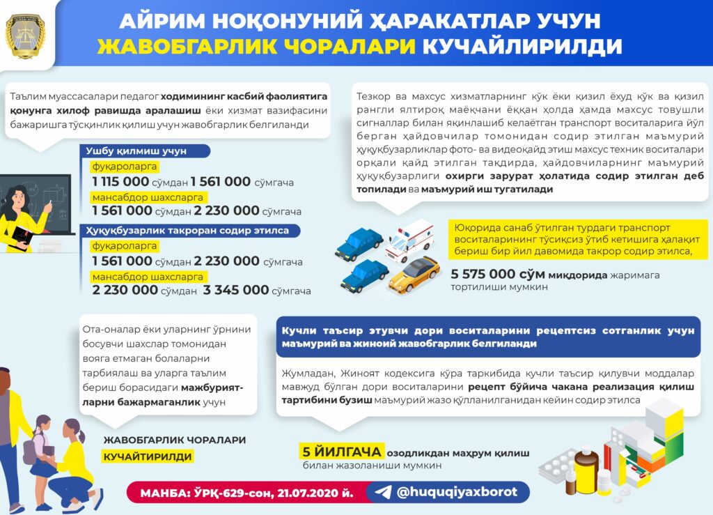 • MANSABDOR ShAXSLARGA 1 mln 561 ming so‘mdan 3 mln 345 ming so‘mgacha jarima qo‘llanishi mumkin.