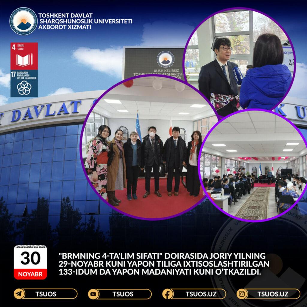 TDSHU Yapon filologiyasi kafedrasi hamkorlari bo‘lmish Tsukuba Universiteti va 133-maktab bilan birgalikda “BRMning 17-Barqaror rivojlanish yo‘lida hamkorlik” va «BRMning 4-Ta’lim sifati» doirasida joriy yilning 29-noyabr kuni yapon tiliga ixtisoslashtirilgan 133-idum da Yapon madaniyati kuni o‘tkazildi.