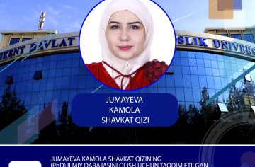 Jumayeva Kamola Shavkat qizining 10.00.05 – Osiyo va Afrika xalqlari tili va adabiyoti ixtisosligi bo‘yicha tayyorlagan “Xoqoniy Shirvoniy ijodida qasida janri (kompozitsion xususiyatlari, motivlari, badiiyati)” mavzusidagi filologiya fanlari bo‘yicha falsafa doktori (PhD) ilmiy darajasini olish uchun taqdim etilgan dissertatsiya himoyasi. 2025-yil, 20-sentabr, soat 9:00. ...