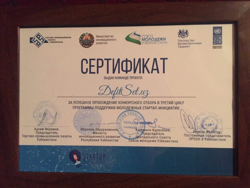 2018-yilning 13-noyabr kuni O’zbekiston Savdo-sanoat palatasi, O’zbekiston Respublikasi Innovatsion rivojlanish vazirligi, Buyuk Britaniyaning Toshkentdagi Elchoxonasi, UNDP Uzbekistan va O’zbekiston Yoshlar Ittifoqi tomonidan tashkil etilgan «Start-ap tashabbuslari» yoshlar inovatsion loyihalarini qo’llab quvvatlash dasturining 3-sikli start oldi va loyihalarni saralash bosqichi o’tkazildi. Ushbu bosqichda institutimizning tashabbuskor birinchi kurs talabalari ham o’zlarining «DefitSet» loyihasi bilan ishtirok etdib, keyingi bosqichga yo’llanmani qo’lga kiritdilar.