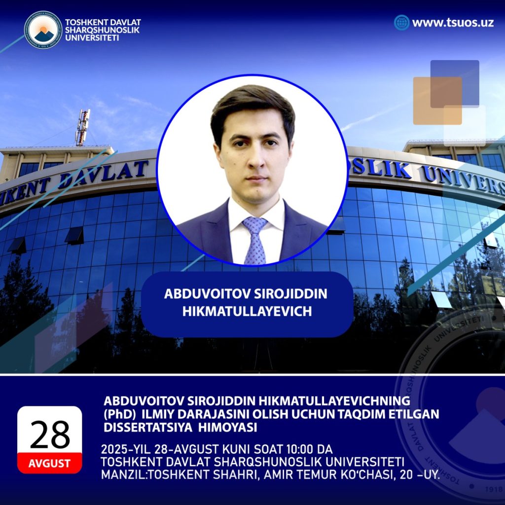 Abduvoitov Sirojiddin Hikmatullayevichning 23.00.04 – “Xalqaro munosabatlar, jahon va mintaqa taraqqiyotining siyosiy muammolari” ixtisosligi bo‘yicha tayyorlagan “O‘zgarayotgan dunyo tartibotida Turkiyaning zamonaviy xalqaro munosabatlardagi o‘rni” mavzusidagi siyosiy fanlar bo‘yicha falsafa doktori (PhD) ilmiy darajasini olish uchun taqdim etilgan dissertatsiya himoyasi. 2025-yil, 28-avgust, soat 10:00.
