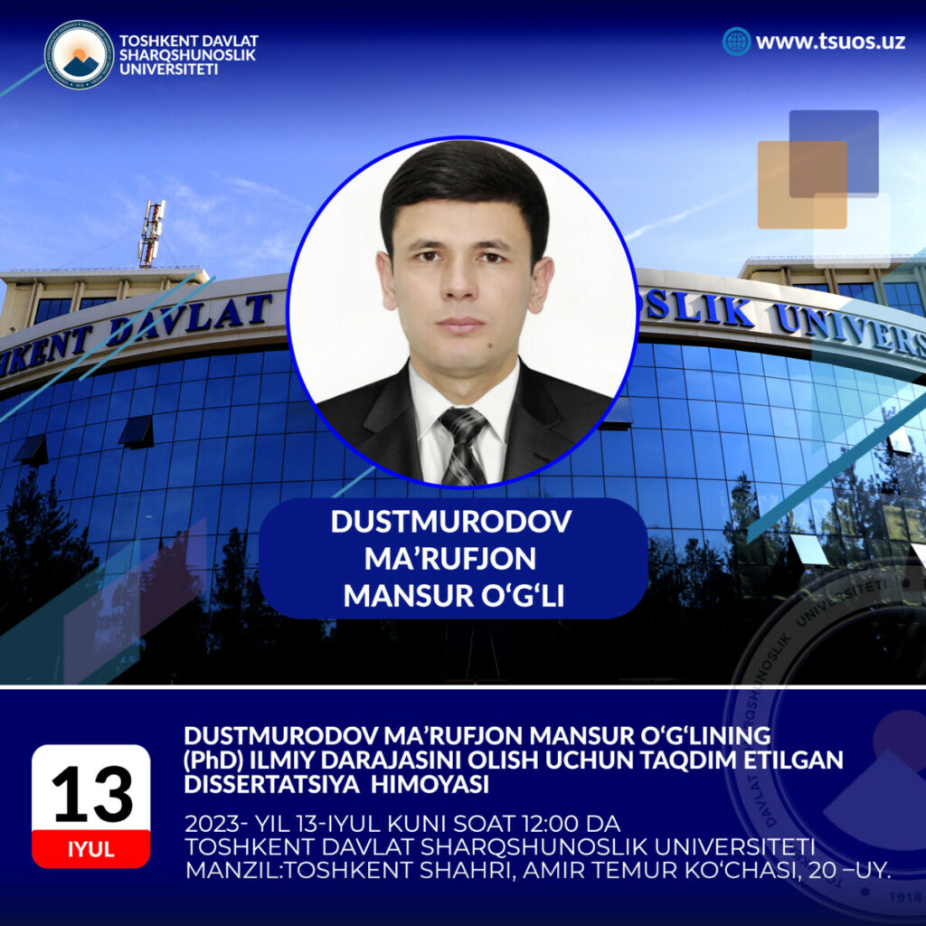 Dustmurodov Maʼrufjon Mansur o‘g‘lining 10.00.05 – Osiyo va Afrika xalqlari tili va adabiyoti ixtisosligi bo‘yicha tayyorlagan “O‘rxun-Yenisey bitigtoshlaridagi harbiy terminlar tadqiqi” mavzusidagi filologiya fanlari bo‘yicha falsafa doktori (PhD) ilmiy darajasini olish uchun taqdim etilgan dissertatsiya himoyasi. 2023-yil, 13-iyul soat 12:00.