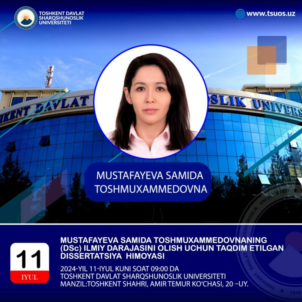 Mustafayeva Samida Toshmuxammedovnaning 10.00.05 – Osiyo va Afrika xalqlari tili va adabiyoti ixtisosligi bo‘yicha tayyorlagan “Ming dаvri romаnlаri tilining morfologik, leksik-semаntik vа frаzeologik xususiyatlаri” mavzusidagi filologiya fanlari doktori (DSc) ilmiy darajasini olish uchun taqdim etilgan dissertatsiya himoyasi. 2024-yil, 11-iyul, soat 09:00.