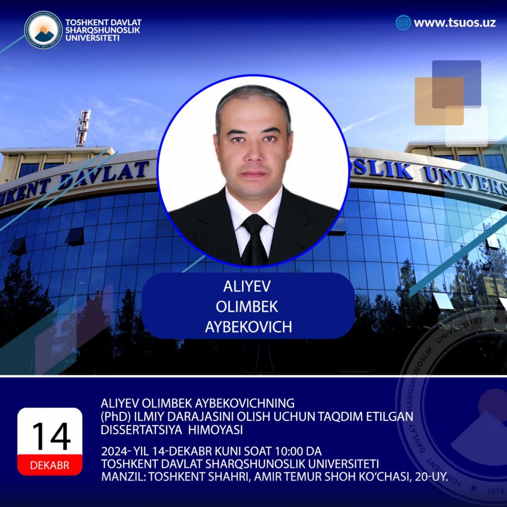 Aliyev Olimbek Aybekovich 23.00.02 – Dissertation written for obtaining the degree of Doctor of Philosophy (PhD) in political sciences on the topic «National and foreign aspects of ensuring the stability of society in the state information security policy» in the specialty of political institutions, processes and technologies, defense will be held at the meeting of the Academic Council numbered DSc.03/29.12.2022.Ss.21.02 at the Tashkent State University of Oriental Studies at 10:00 on December 14, 2024.