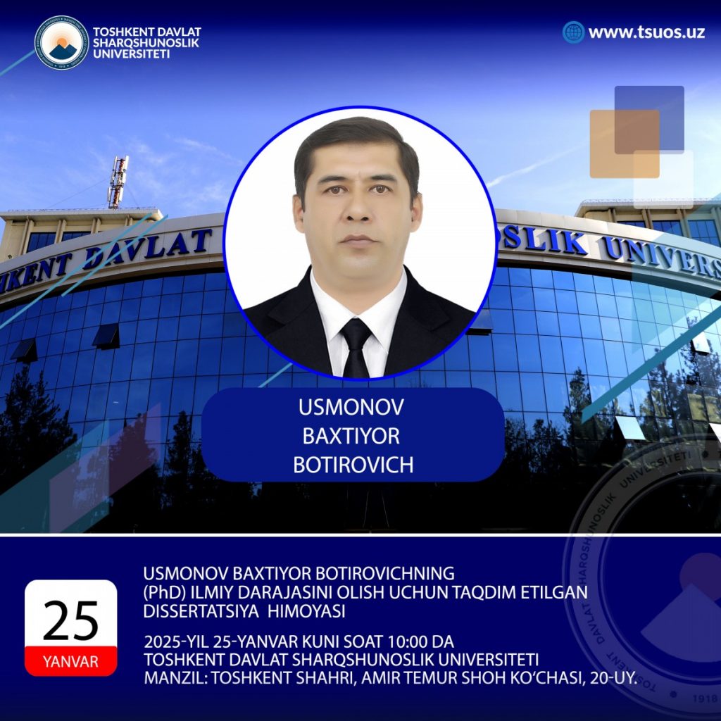 Usmonov Baxtiyor Botirovichning 07.00.05 – Xalqaro munosabatlar va tashqi siyosat tarixi ixtisosligi bo‘yicha “O‘Zbekiston Respublikasi va Tojikiston Respublikasi o‘rtasidagi davlatlararo munosabatlar va hamkorlik aloqalari” mavzusida tarix fanlari bo‘yicha falsafa doktori (PhD) ilmiy darajasini olish uchun yozilgan dissertatsiya ishi himoyasi Toshkent davlat sharqshunoslik universiteti huzuridagi ilmiy darajalar beruvchi DSc.03/31/01/2024/Tar.21.03 raqamli Ilmiy kengashning 2025-yil 25-yanvar kuni soat 10:00 dagi majlisida bo‘lib o‘tadi.