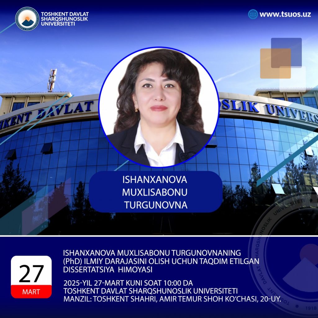 Ishanxanova Muxlisabonu Turgunovnaning 10.00.05 – Osiyo va Afrika xalqlari tili va adabiyoti ixtisosligi bo‘yicha “XVIII asr arab tili grammatikasiga oid asarning xususiyatlari (Ibn Farhatning “Bahth аl-maTālib wа hаss аl-Tālib” asari misolida)” mavzusida filologiya fanlari boʻyicha falsafa doktori (PhD) ilmiy darajasini olish uchun taqdim etilgan dissertatsiya himoyasi 27-mart 2025-yil soat 10:00da bo‘lib o‘tadi.