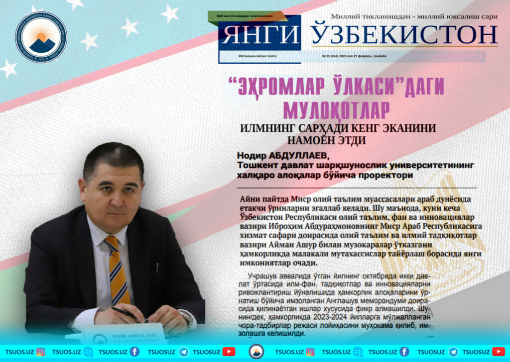TDSHUning xalqaro aloqalar bo’yicha prorektori Nodir Abdullayevning «Ehromlar o’lkasi»dagi muloqotlar nomli maqolasi chop etildi.
