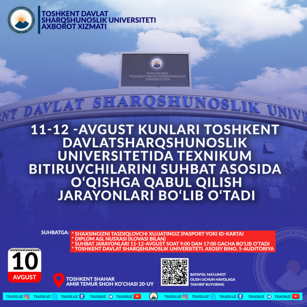 (Uzbek) 11-12-avgust kunlari texnikum bitiruvchilarini suhbat asosida qabul qilish jarayonlari bo’lib o’tadi