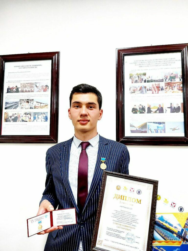 Suyarov Komiljon, deputy of the Youth Parliament under the Legislative Chamber of the Oliy Majlis, a first-year student of the “Political Science” direction of the Tashkent State University of Oriental Studies, took part in the international competition “Young Scientist 2021”, where he won first place and was awarded a Gold Medal.