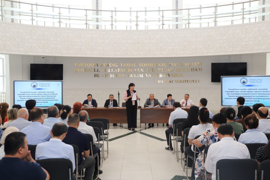 In the second part of the Council meeting, information was presented on the implementation of the decisions of the President and Government of the Republic of Uzbekistan, the Ministry of Higher Education, Science and Innovation, the Collegium decisions and orders, as well as the resolutions of the University Council. In addition, the results of the summer semester, final state examinations, and master’s thesis defenses were reviewed. The Council also discussed the nomination of candidates for the 2025/2026 Presidential and named state scholarships. The report on the Council’s activities during the 2024–2025 academic year and the performance of scientific centers and research projects was also presented.