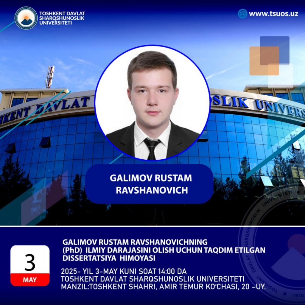 Defense of the thesis of Galimov Rustam Ravshanovich on the topic “Pakistan’s factor in ensuring regional security in South Asia” submitted for the degree of Doctor of Philosophy in political sciences (PhD) in the specialty 23.00.04 – “International relations, political problems of world and regional development” will be held at a meeting of the Academic Council under the number DSc.03/29.12.2022.Ss.21.02 at Tashkent State University of Oriental Studies at 14:00 on May 3, 2025.