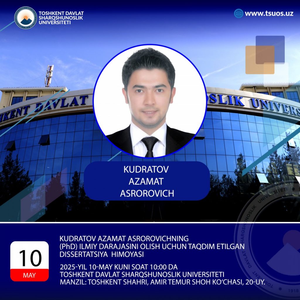Kudratov Azamat Asrorovich, the dissertation prepared by specialty 10.00.06 – Comparative literary criticism, contrastive linguistics and translation studies on the topic: “The usage of simultaneous translation strategies in the political-economical sphere” to obtain the degree of Doctor of philosophy (PhD) on philological sciences. The defense will take place: 2025, May 10, at 10:00 pm.