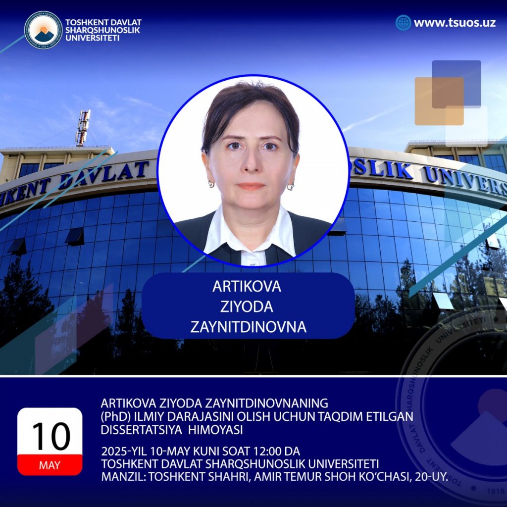 Artikova Ziyoda Zaynitdinovna, the dissertation prepared by specialty 10.00.05 – Asian and African Languages and Literatures on the topic: “The Polyfunctional features of the Chinese сharacter 把 “ba” to obtain the degree of Doctor of philosophy (PhD) on philological sciences. The defense will take place: 2025, may 10, at 12:00 pm.
