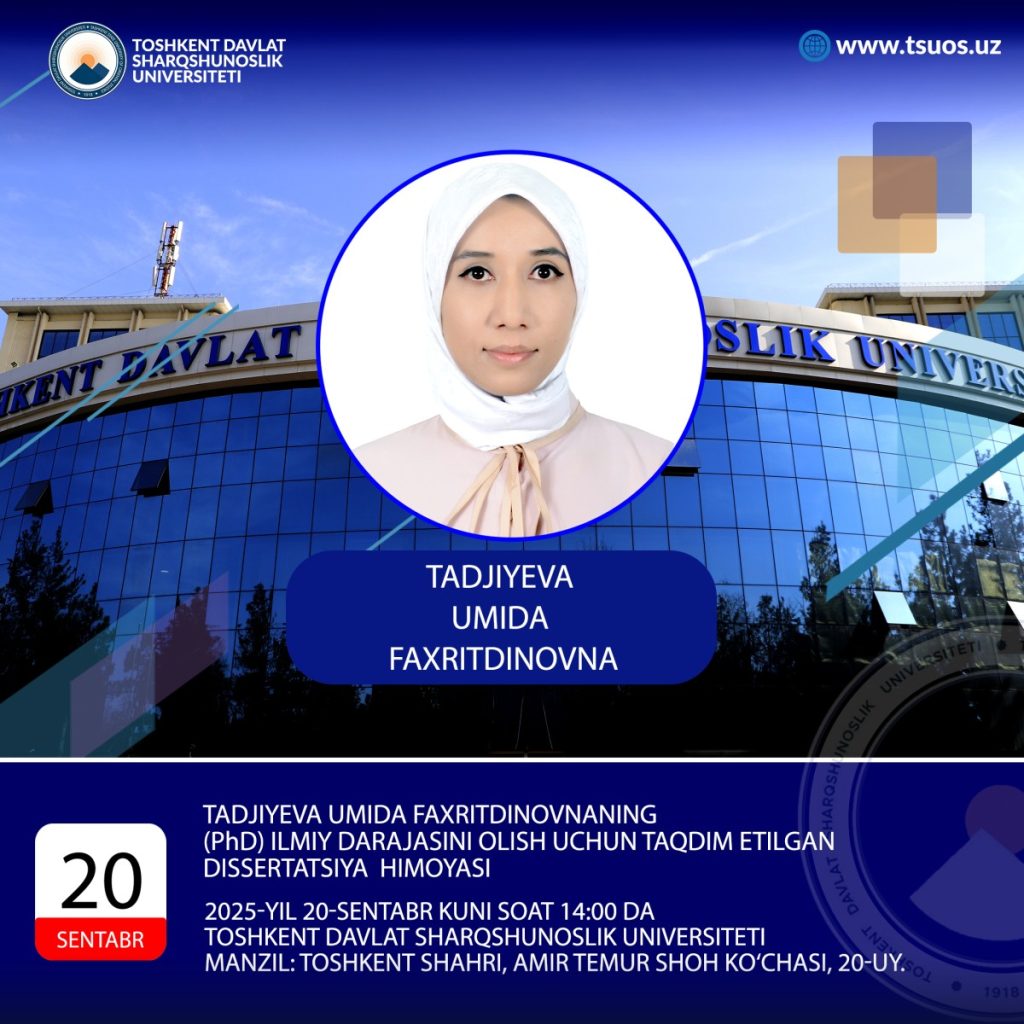 Tadjiyeva Umida Fahkritdinovna, the dissertation prepared by specialty 10.00.06 – Comparative literary criticism, contrastive linguistics and translation studies on the topic: “Linguocultural features of Arabic and Uzbek proverbs” to obtain the degree of Doctor of philosophy (PhD) on philological sciences. The defense will take place: 2025, September 20, at 14:00 pm.