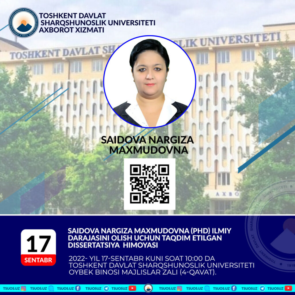 Saidova Nargiza Maxmudovna the dissertation prepared by specialty 10.00.05 – National languages and literature of Asia and Africa on the topic: “Formation and development of the Saudi realistic story” to obtain the degree of Doctor of philosophy (PhD) on philological sciences. The defense will take place: 2022, September 17, at 10 a.m.