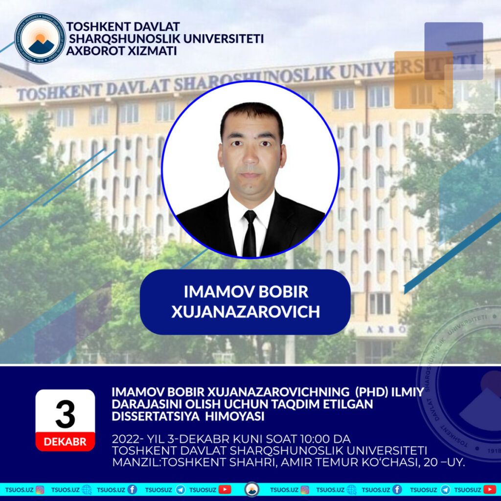 Defense of the thesis of Imamov Bobir Khuzhanazarovich on the topic “Economic and cultural relations between the Republics of Uzbekistan and Turkey (1991-2018)” submitted for the degree of Doctor of Philosophy in history (PhD) in the specialty history of International Relations and foreign policy – 07.00.05 will be held at a meeting of the Academic Council under the number PhD/03/30.12.2021/ SS/TAR.21.02 at Tashkent State University of Oriental Studies at 10:00 a.m. on December 3, 2022. Address: Tashkent city, Amir Temur Street, 20.