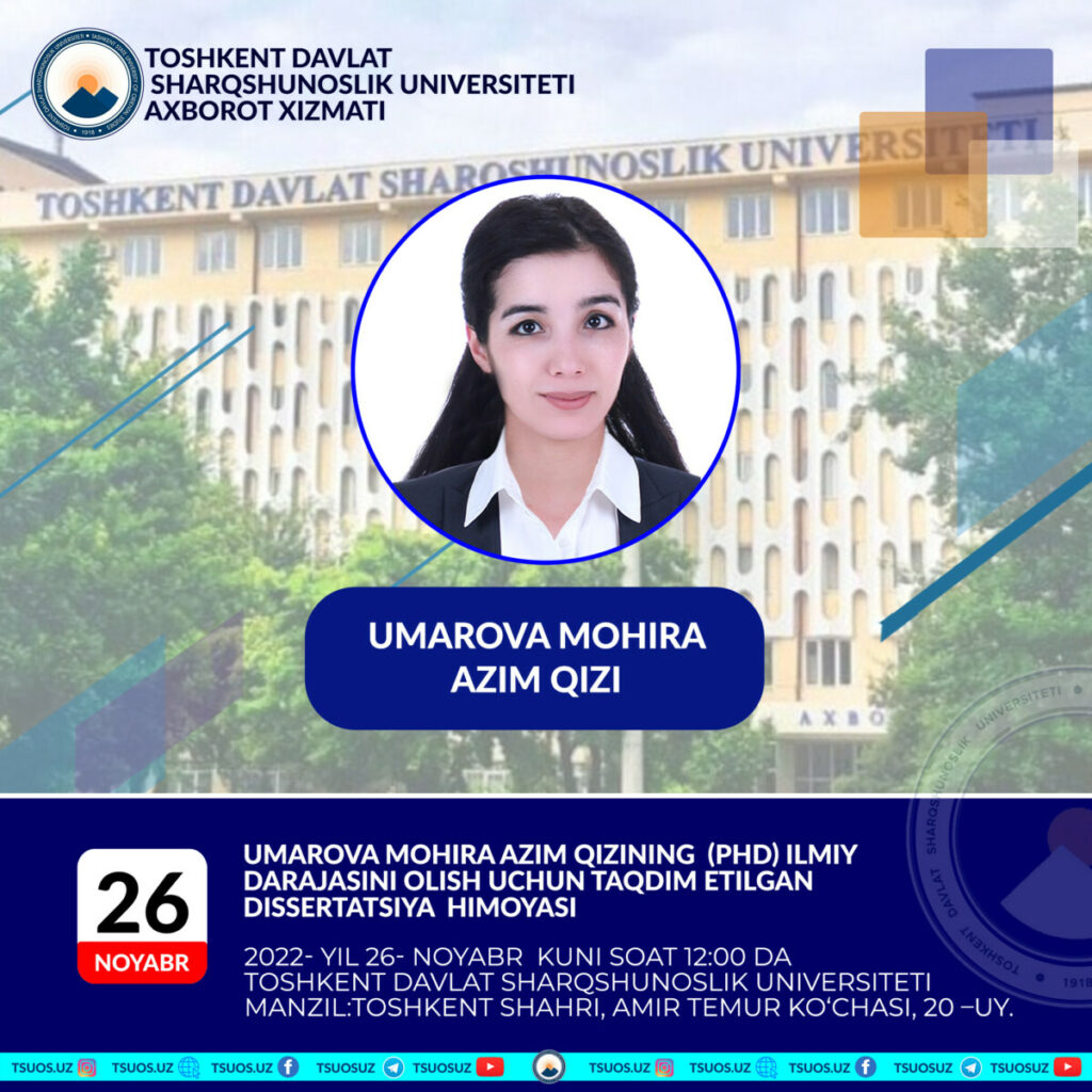 Umarova Mokhira Azim kizi the dissertation prepared by specialty 10.00.06 – Comparative literary criticism, contrastive linguistics and translation studies on the topic: “Expression of national coloring in Urdu translations of Uzbek prose of the 20th century” to obtain the degree of Doctor of philosophy (PhD) on philological sciences. The defense will take place: 2022, November 26, at 12.00pm.