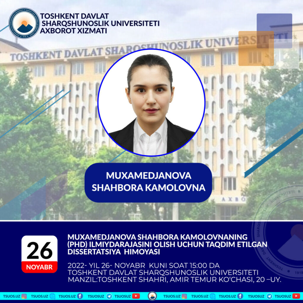 Mukhamedjanova Shahbora Kamolovna the dissertation prepared by specialty 10.00.05 – National languages and literature of Asia and Africa on the topic: “Lexical-semantic and functional analysis of verbs of motion direction in Chinese” to obtain the degree of Doctor of philosophy (PhD) on philological sciences. The defense will take place: 2022, November 26, at 3.00pm.