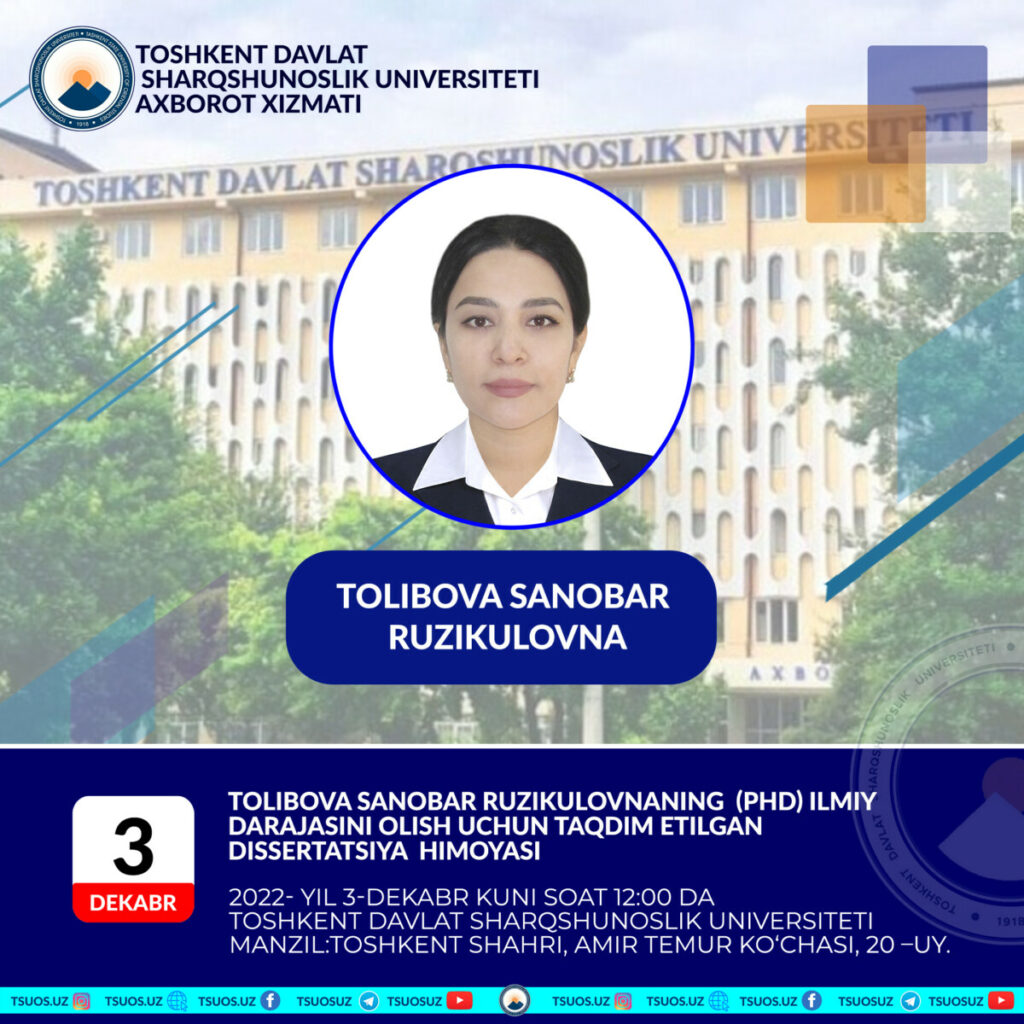 The defense of the dissertation to obtain the degree of Doctor of Philosophy (PhD) in Historical Sciences of Tolibova Sanobar Ruzikulovna on the topic: “The main directions of cultural and humanitarian relations between Uzbekistan and the countries of Southeast Asia (1991-2019)” which is prepared by specialty 07.00.05 – History of international relations and foreign policy. The defense will take place: in 2022, on December 3 at 12:00.