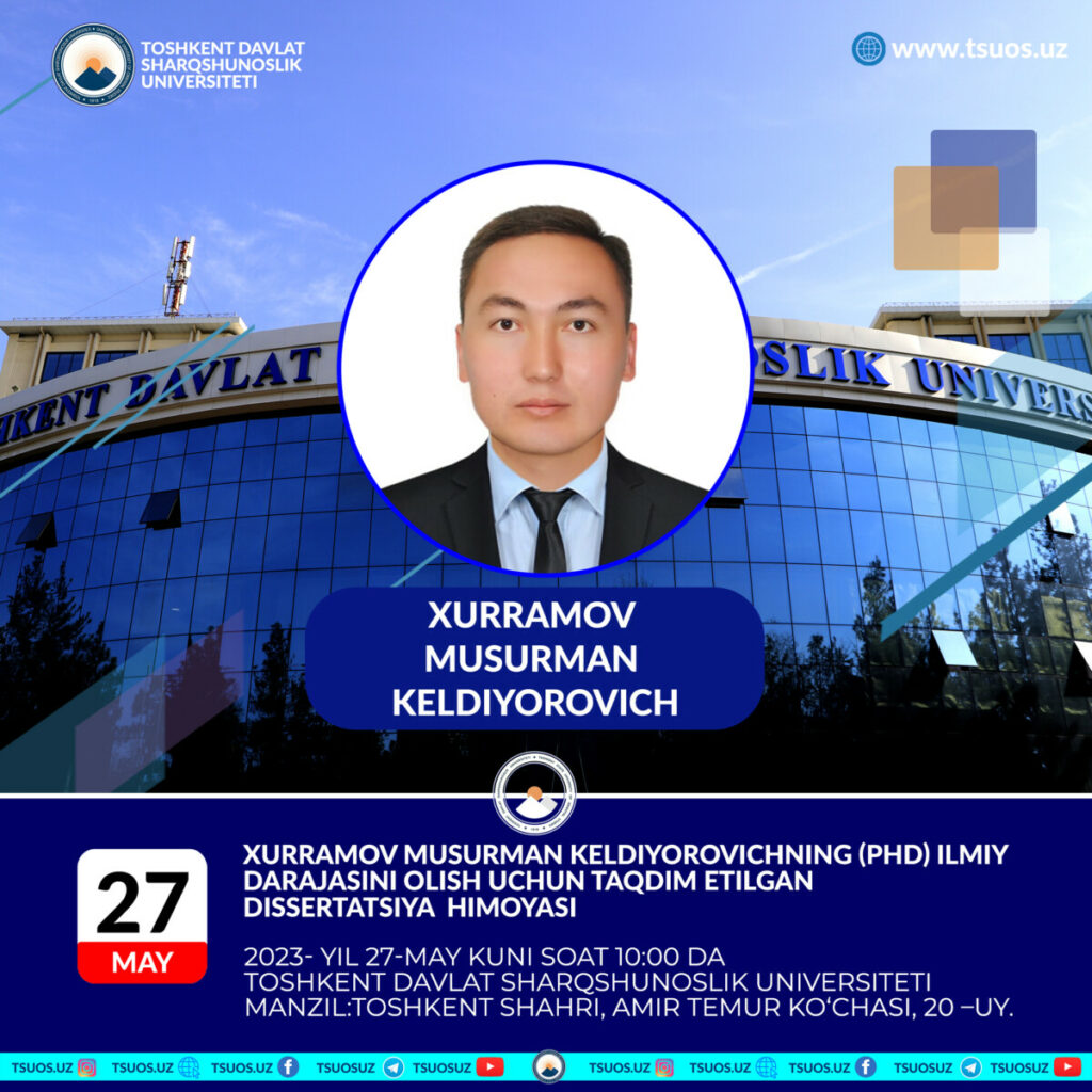 Khurramov Musurman Keldiyorovich will defend his dissertation, submitted for the degree of Doctor of Philosophy (Ph.D.) in Political Science, on the topic “The evolution of bilateral relations between the Republic of Uzbekistan and the Republic of Kazakhstan in 1991 – 2016” prepared on the specialty 07.00.05 – History of International Relations and Foreign policy. The dissertation defense will be held on May 27, 2023, at 10:00 a.m.
