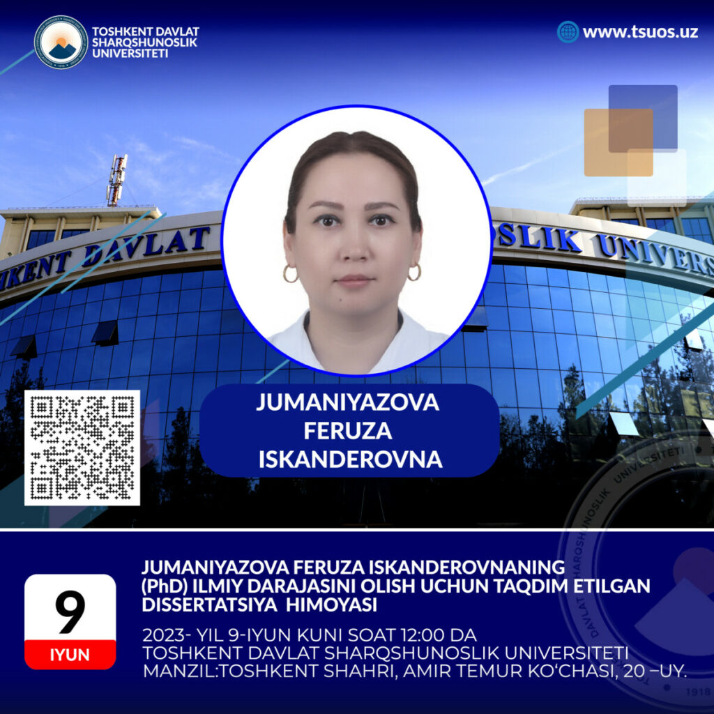 Jumaniyazova Feruza Iskanderovna, the dissertation prepared by specialty 10.00.05 – National languages and literature of Asia and Africa on the topic: “Phonetic interference in Korean language (based on borrowed nouns)” to obtain the degree of Doctor of philosophy (PhD) on philological sciences. The defense will take place: 2023, June 9, at 12.00 pm.