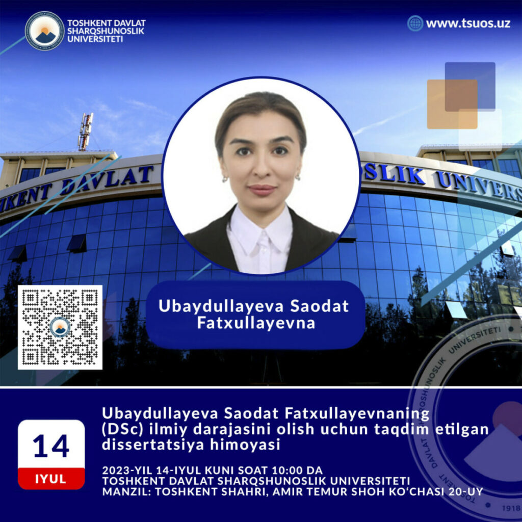 Ubaydullaeva Saodat Fatkhullaevna will defend her dissertation, submitted for the degree of Doctor of Political Science (DSc), on the topic “Problems and prospects of the formation of a system of interconnectedness of regional security in Central Asia” prepared on the specialty 23.00.04 — International Relations, Political Problems of the World, and Regional Development. The dissertation defense will be held on July 14, 2023, at 10:00 p.m