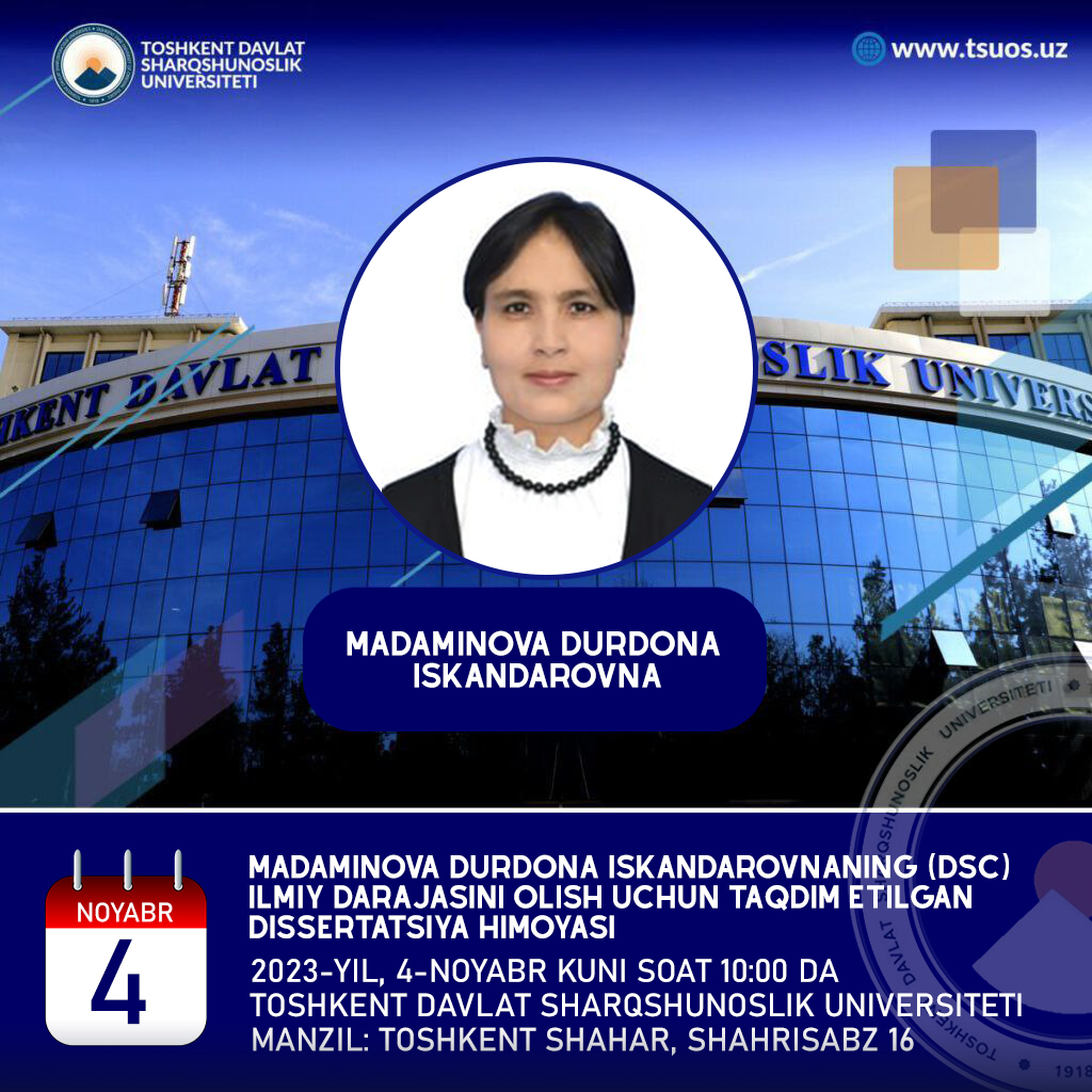 Madaminova Durdona Iskandarovna will defend his dissertation, submitted for the degree of Doctor of Political Science (DSc), on the topic “The impact of migration processes in the Middle East on the security and stability of Arab соuntries” prepared on the specialty 23.00.02 – Political institutions, processes, and technologies. The dissertation defense will be held on November 4, 2023, at 10:00 p.m.