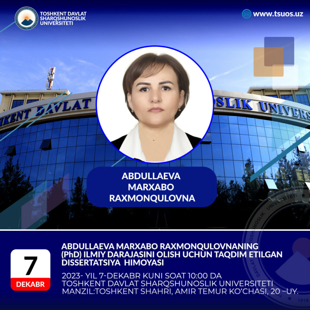 Abdullaeva Markhabo Rakhmonkulovna, the dissertation prepared by specialty 10.00.06 – Comparative literary studies, cross-linguistics and translation studies on the topic: “Problems of translation of phraseology expressing national color (as an example of Uzbek translations of Agatha Christie’s works)” to obtain the degree of Doctor of philosophy (PhD) on philological sciences. The defense will take place: 2023, December 7, at 10.00 am.