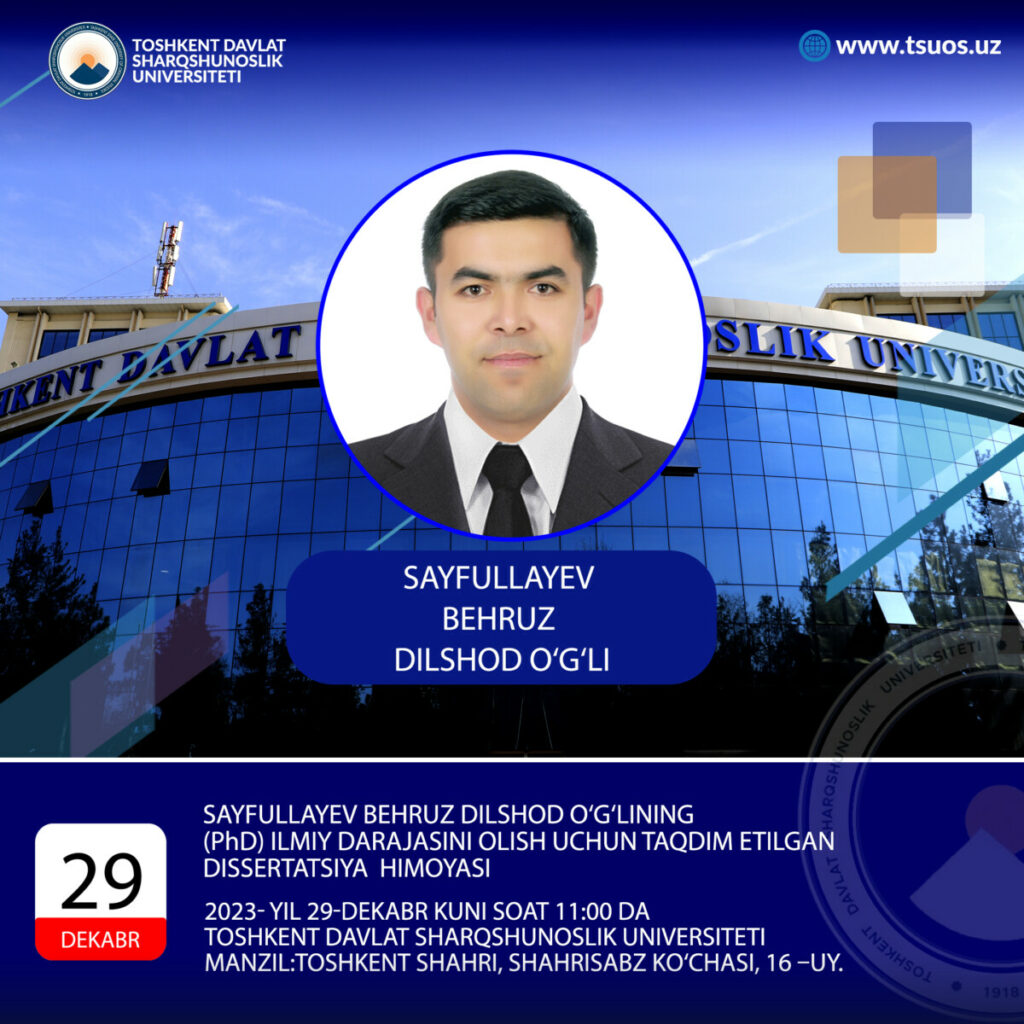 Sayfullayev Behruz Dilshod ugli will defend his dissertation, submitted for the degree of Doctor of Philosophy (Ph.D.) in Historical Science, on the topic “History of formation and development of relations between Uzbekistan and India (1991-2021)” prepared on the specialty 07.00.05 – History of international relations and foreign policy. The dissertation defense will be held on December 29, 2023, at 11:00 p.m.
