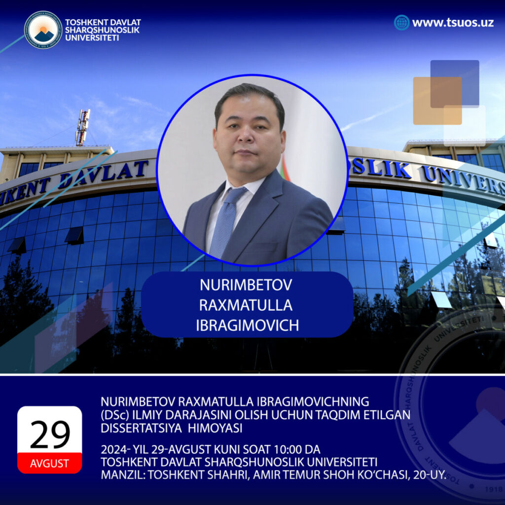 Nurimbetov Rakhmatulla Ibragimovich will defend his dissertation, submitted for the degree of Doctor of Political Science (DSc), on the topic “Strategic approaches of the Republic of Uzbekistan within the Shanghai Cooperation Organization: current situation and perspectives” prepared on the specialty 23.00.04 — International relations, political problems of the world, and regional development. The dissertation defense will be held on August 29, 2024, at 10:00 a.m.