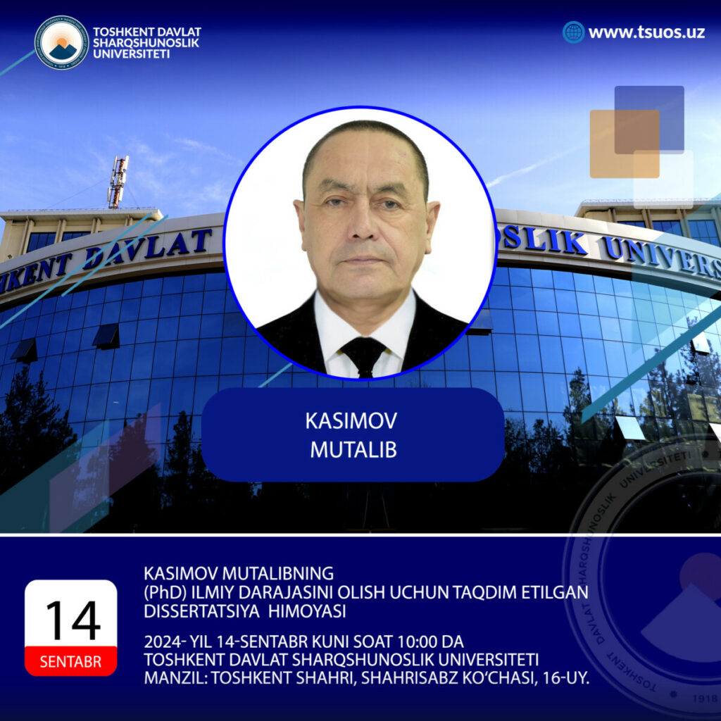 Defense of a Doctor of Philosophy (PhD) dissertation (in political science) on the topic “The influence of the Afghan factor on security issues between the USA and Pakistan” in specialty 23.00.04. – international relations, political problems of world and regional development by Kasimov Mutalib will take place on September 14, 2024 at 12:00 at the Tashkent State University of Oriental Studies.