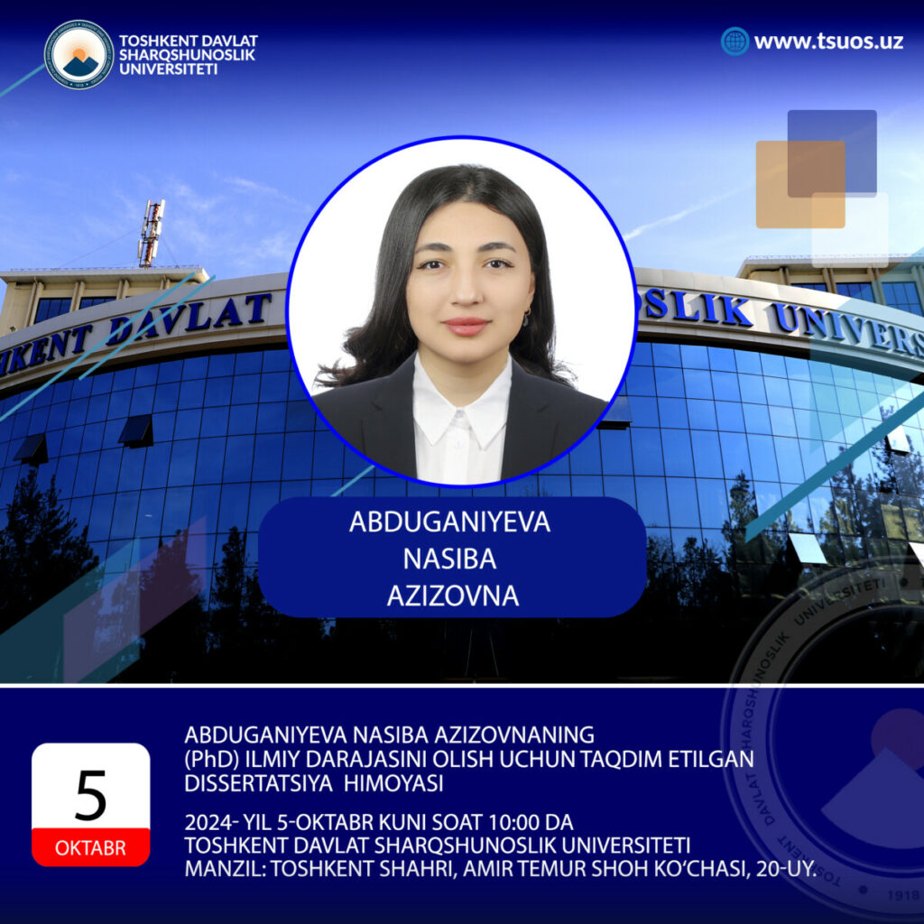Abduganiyeva Nasiba Azizovna, the dissertation prepared by specialty 10.00.05 – Languages and literature of the people of Asia and Africa on the topic: “Poetics of Indonesian fairy tales” to obtain the degree of philosophy (PhD) on philological sciences. The defense will take place: 2024, October 5, at 10:00 am.
