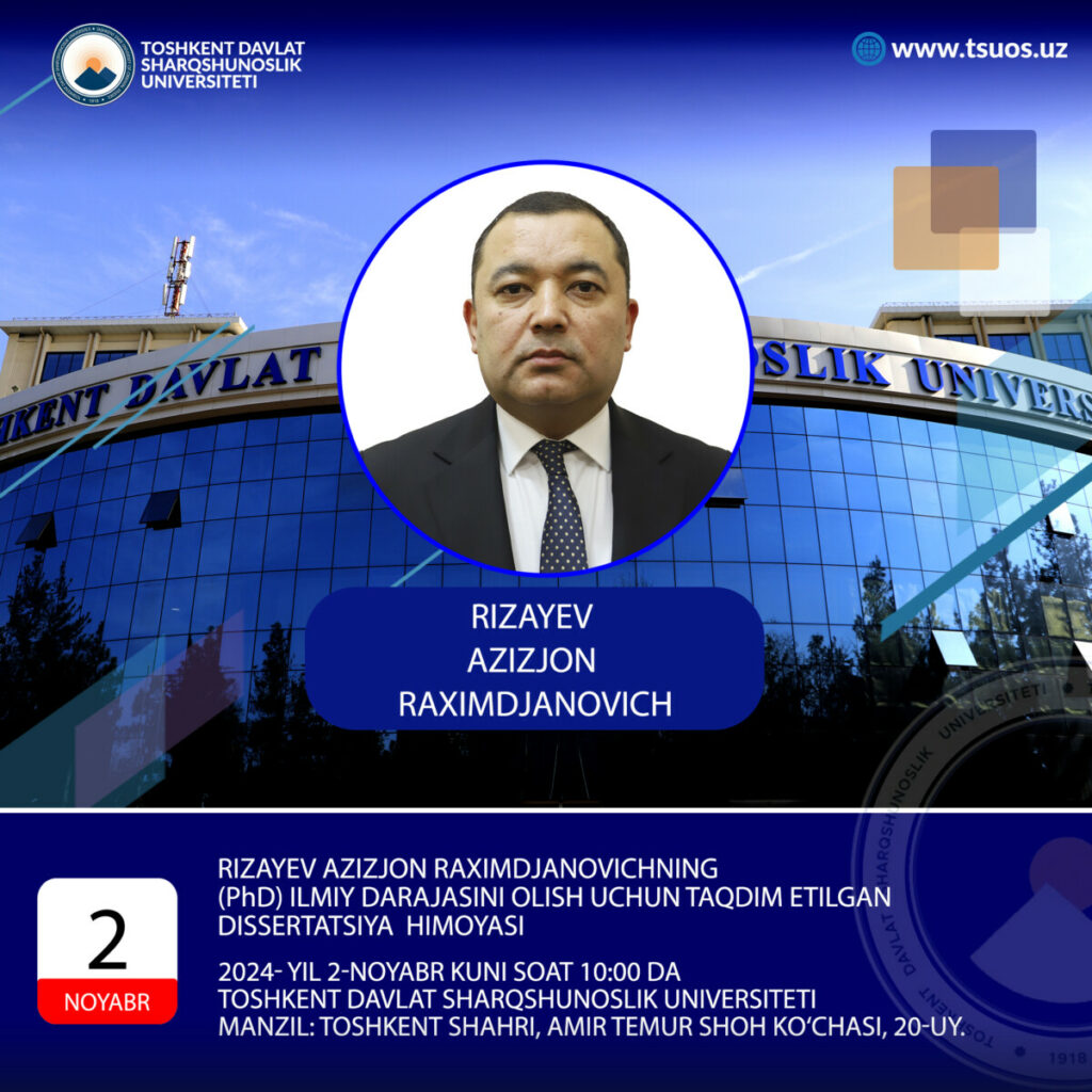 The defense of the dissertation to obtain the degree of Doctor of Philosophy (PhD) in Political Sciences of Rizaev Azizdjon Rakhimdjanovich on the topic: “Security Paradigm of Saudi Arabia’s National Identification” which is prepared by specialty 23.00.02 – Political institutions, processes, and technologies. The defense will take place: in 2024, on November 2 at 10:00.