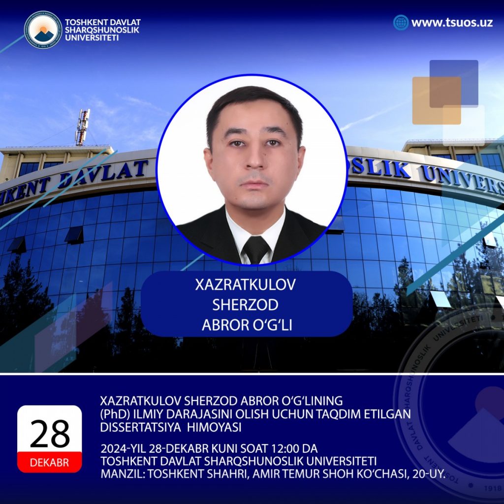 Defense of the thesis of Khazratkulov Sherzod Abror ogli on the topic “Development of social policy mechanisms to ensure sustainable improvement of society submitted for the degree of Doctor of Philosophy in political sciences (PhD) in the specialty Political institutions, processes and technologies – 23.00.02 will be held at a meeting of the Academic Council under the number DSc.03/29.12.2022.Ss.21.02 at Tashkent State University of Oriental Studies at 12:00 a.m. on December 28, 2024.