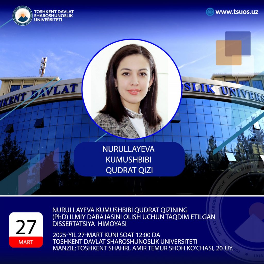 The dissertation defense of Nurullayeva Kumushbibi Qudrat qizi for the degree of Doctor of Philosophy (PhD) in the specialty 10.00.06 – Comparative Literature, Contrastive Linguistics, and Translation Studies on the topic “Study of Kinship Terms in Chinese and Uzbek Languages” will take place.