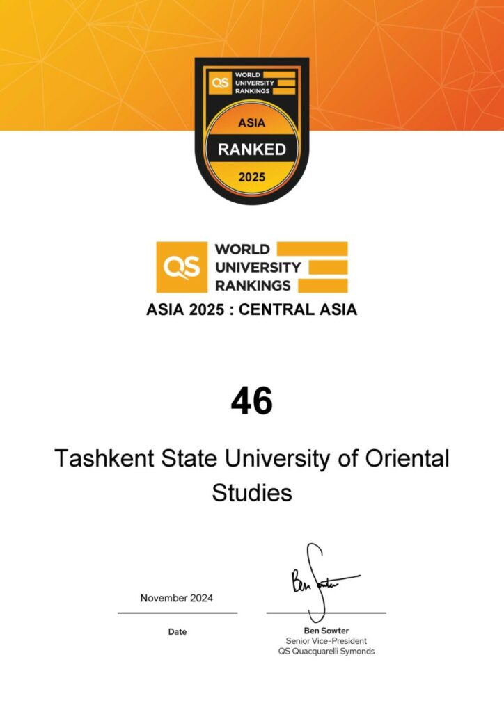 On November 6, 2024, the QS (Quacquarelli Symonds) agency released the QS Asia University Rankings 2025: Central Asia results. Tashkent State University of Oriental Studies advanced its position noticeably, moving up from the 801+ place in the QS Asia University Rankings 2024 to the 701-750rd place this year. Additionally, TSUOS climbed three spots, from 49th to 46th place in the QS Asia University Rankings 2025: Central Asia.