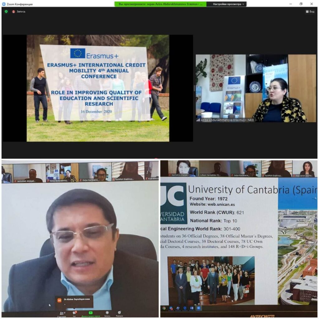 On December 16, 2020, at the initiative of the National Group of Experts in Higher Education Erasmus +, the IV Republican Scientific and Practical Conference “International Credit Mobility: Its Role and Significance in Improving the Quality of Education and Research” was held, the purpose of which was to improve the quality and efficiency of the educational process and scientific research specialists of Uzbekistan through the exchange of knowledge and experience accumulated during the period of mobility and the implementation of the results achieved in scientific research in Uzbekistan.