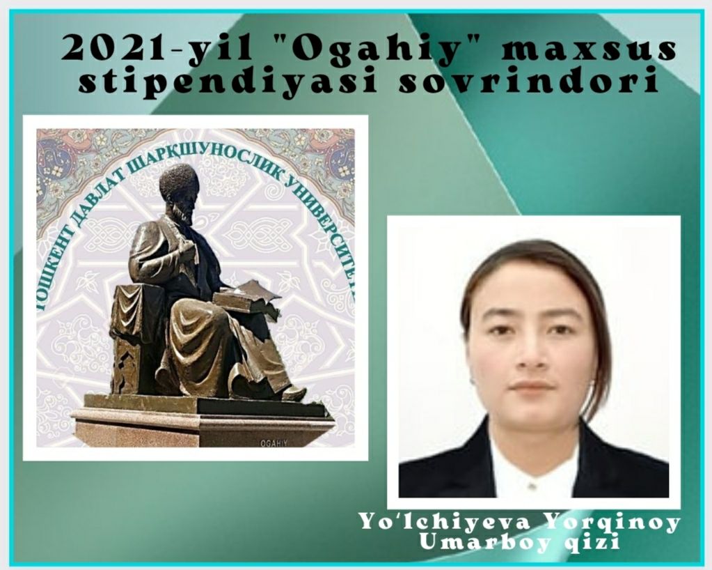 Yulchiyeva Yorkinoy, a 2nd-year student of the Faculty of Economics, Politics and Tourism of the Eastern Countries of the Tashkent State University of Oriental Studies, participated in the competition “Special scholarship named after Ogahi” and became the winner of the competition. We wish Yorkinoy great success in his educational activities!