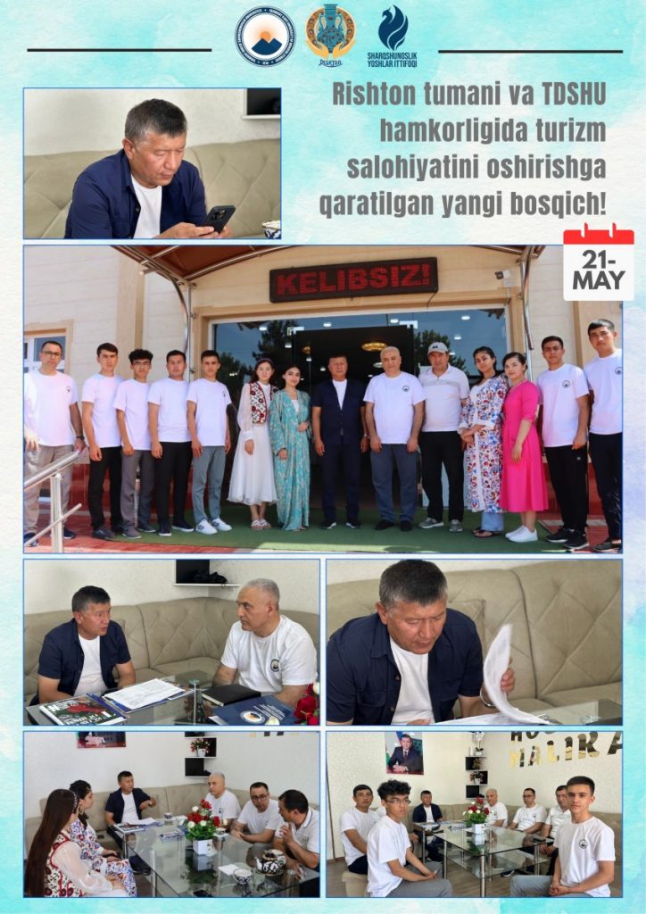 On May 21, Bahodir Rahmatullayevich Khaliqov, the head of the Rishton district, met with the tourism working group from Tashkent State University of Oriental Studies, who visited the district. During the meeting, issues related to the implementation of the plan to enhance the tourism potential of the Rishton district, aligned with the Presidential Decrees of the Republic of Uzbekistan from April 26, 2023 (PQ-135) and July 18, 2024 (PQ-269), were discussed.
