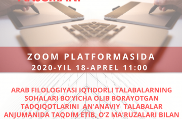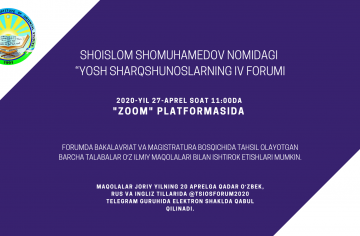 Acceptance of articles for the IV Forum of Young Orientalists named after Shoislom Shomuhamedov has begun. The forum will be held online on April 27, 2020 at 11:00 on the Zoom platform. The forum is open to all undergraduate and graduate students with their research papers. Articles will be accepted electronically in @ tsiosforum2020 Telegram group in Uzbek, Russian and...