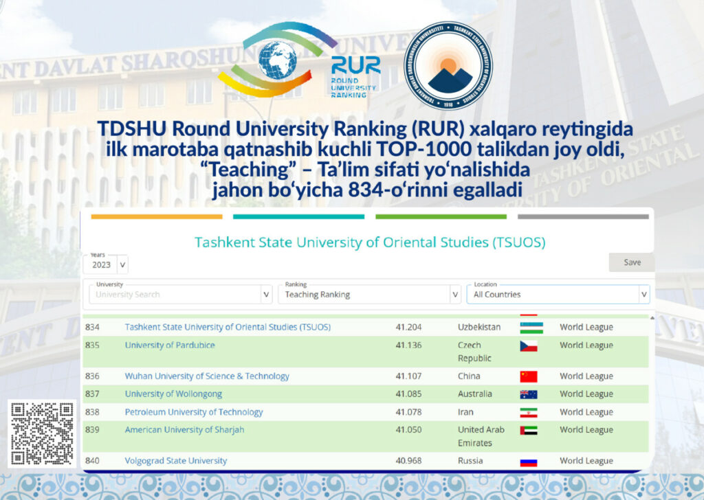 Tashkent State University of Oriental Studies took part in the Round University Ranking (RUR) international ranking for the first year and placed in the strong TOP-1000. In the direction of “Teaching” TSUOS took 834th place in the world.